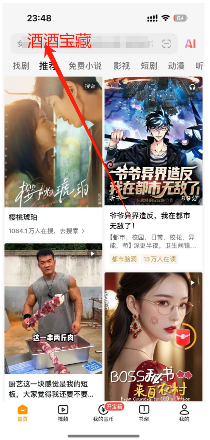 第二步:打开,登录注册之后,点击上方搜索【搜索 酒酒宝藏】